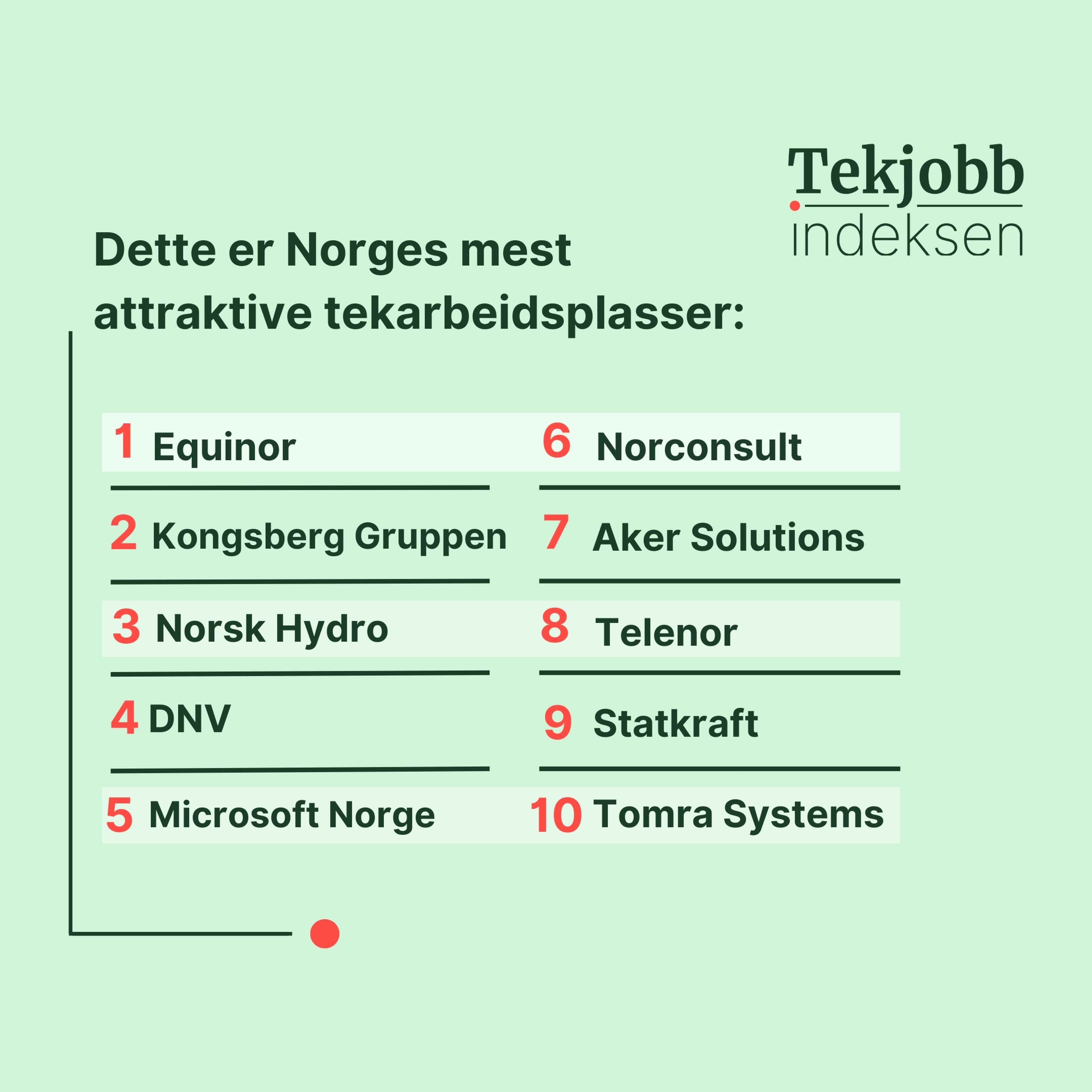 Tekjobb-Indeksen 2024 er en analyse gjennomført av Teknisk Ukeblad Media i samarbeid med Kantar. Analysen kartlegger hvor attraktive 71 norske teknologiarbeidsplasser er blant ingeniører og teknologer.